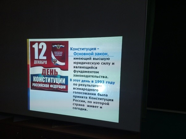 12 декабря в России отмечается день Конституции. В этот день в 1993 году был принят основной закон РФ. Этому празднику были приурочены мероприятия в школе: классные часы, лекции, уроки по обществознанию. Кроме того в 7-9 классах прошла викторина "Россия-Родина моя".
